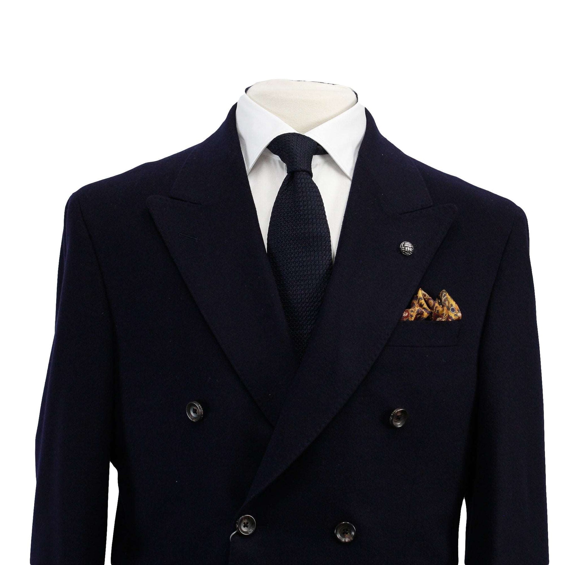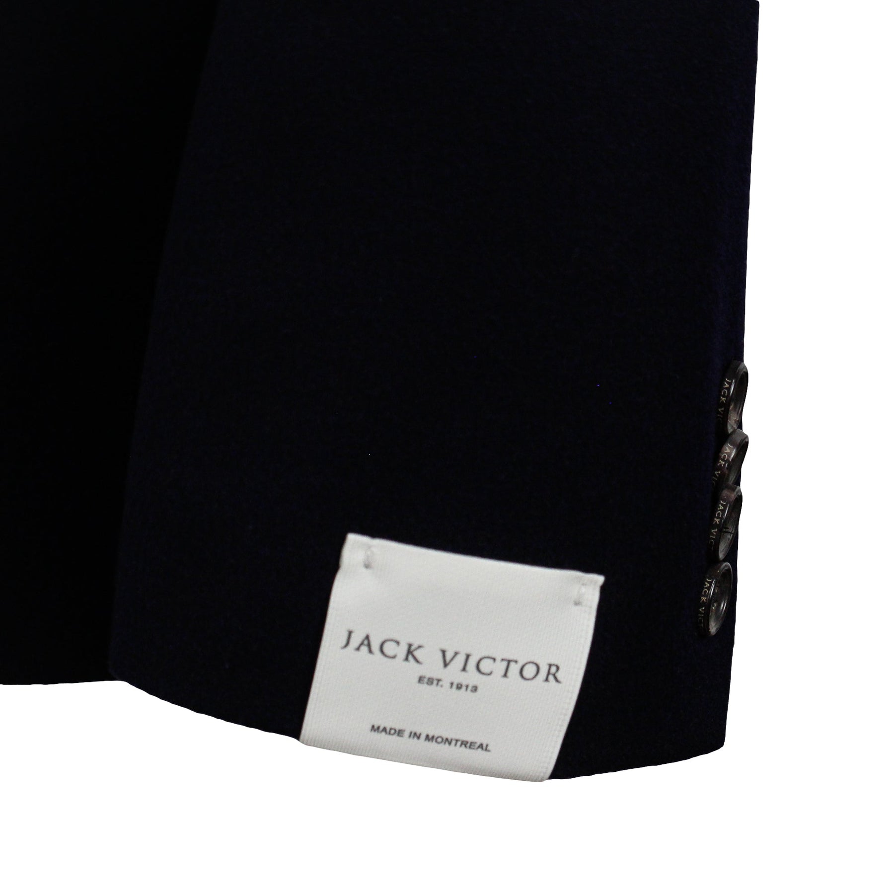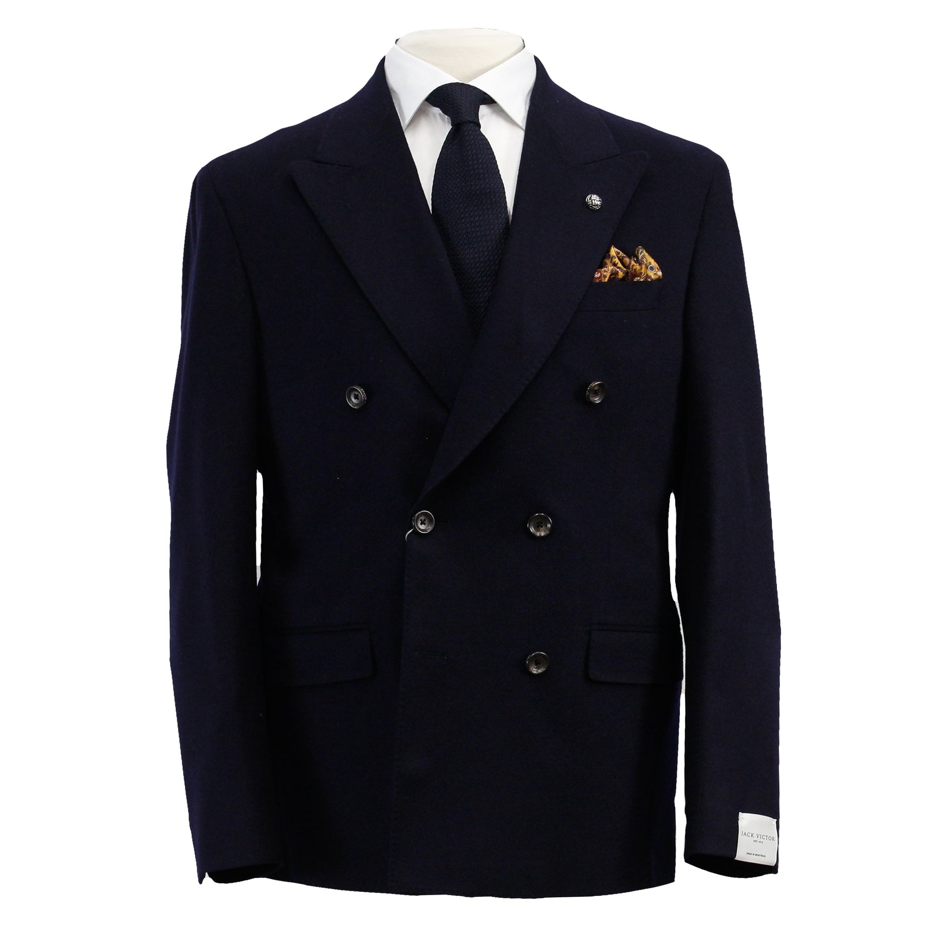 Introducing the Navy Blue Double Breasted Anniversary Blazer Jacket by Jack Victor, a testament to refined style and versatility. Handcrafted in Montreal, this contemporary fit jacket features a very soft shoulder construction, offering both comfort and a contemporary silhouette.