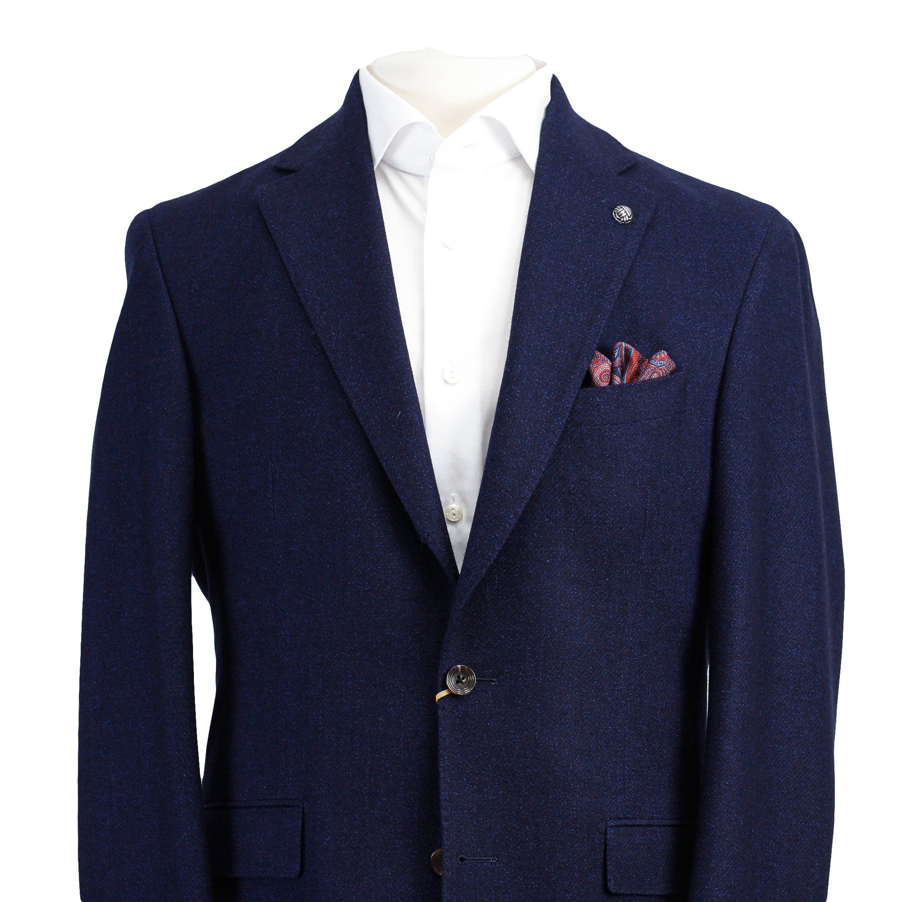 - Single-breasted, two button, notch lapel